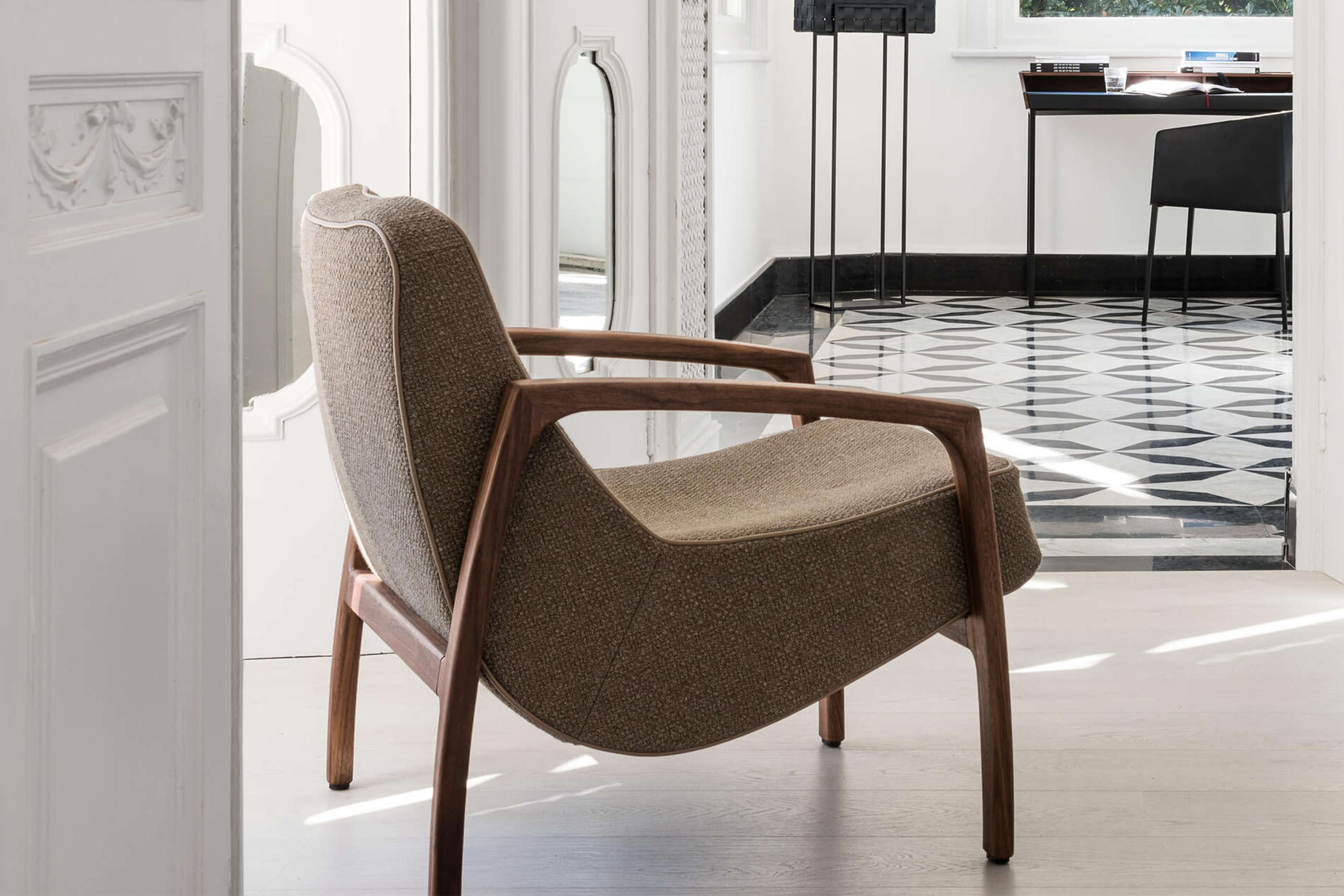 Der Lagom mit Holzarmlehnen aus Nussbaumholz oder Eichenholz geflammt, hat der Designer Hugo de Ruiter ein weiteres nachhaltiges