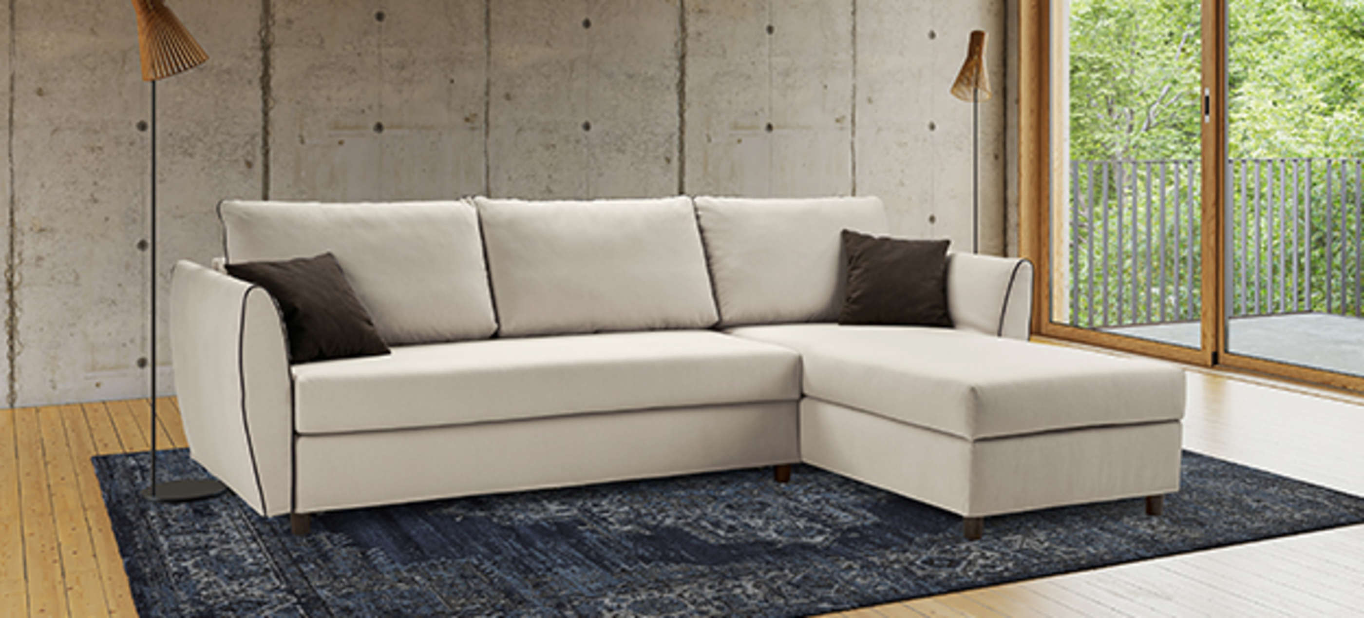 Das Kyoto Ecksofa können Sie dank der gesteckten Armlehnen nach einem Umzug oder anderen Raumsituation, verändern und das Chaiselonuge an der linken oder rechte Seite anbauen. Das Chaiselonuge bietet Ihnen auch einen großen Bettkasten.